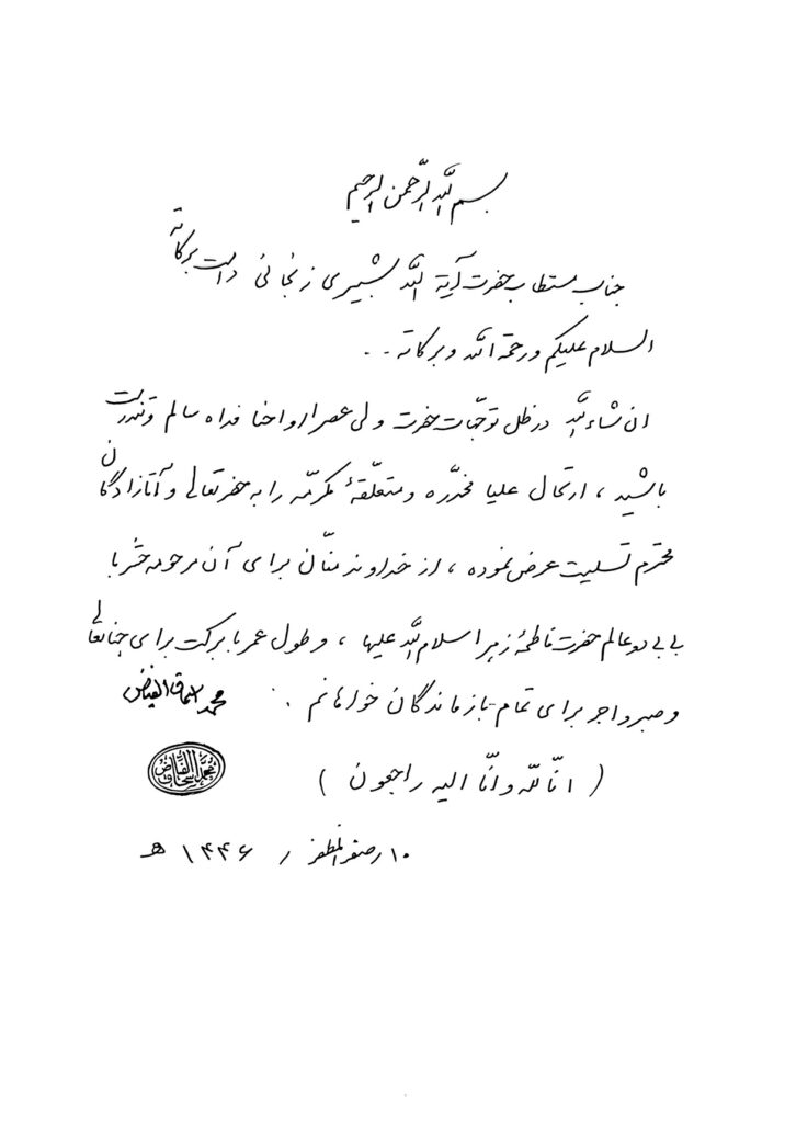 ان شاء الله در ظل توجهات حضرت ولی عصر ارواحنا فداه سالم و تندرست باشید، ارتحال علیا مخدره و متعلقه مکرمه را به حضرتعالی و آقازادگان محترم تسلیت عرض نموده، از خداوند منان برای آن مرحومه حشر با بی بی دو عالم حضرت فاطمه زهرا سلام الله علیها و طول عمر بابرکت برای جنابعالی و صبر و اجر برای تمام بازماندگان خواهانم.